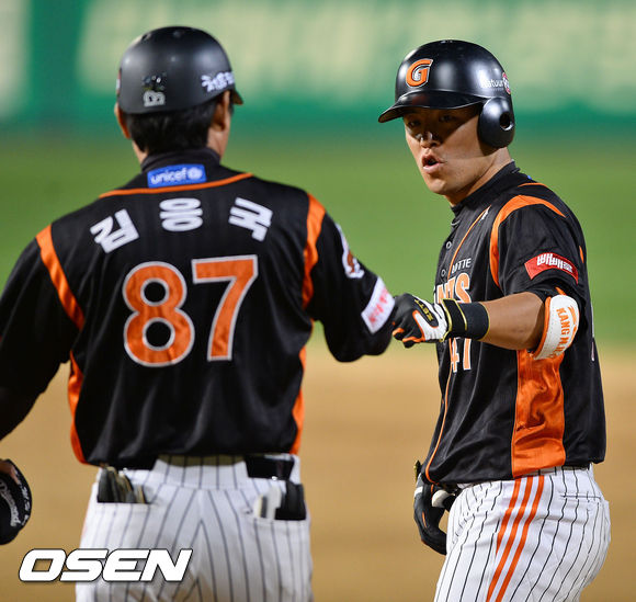 8일 오후 광주 무등구장에서 열린 '2013 한국야쿠르트 세븐 프로야구' KIA 타이거즈와 롯데 자이언츠의 경기, 5회초 2사 2루 롯데 강민호가 1타점 적시타를 날린후 김응국 코치와 하이파이브를 하고 있다.