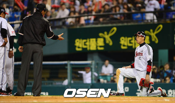 8일 오후 서울 잠실구장에서 열린 '2013 한국야쿠르트 세븐 프로야구' LG 트윈스와 넥센 히어로즈의 경기 6회말 2사 1,2루 이병규가 박성훈의 타구에 맞았다고 주심에게 주장하고 있다.
