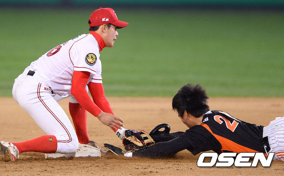 8일 오후 광주 무등구장에서 열린 '2013 한국야쿠르트 세븐 프로야구' KIA 타이거즈와 롯데 자이언츠의 경기,7회초 1사 롯데 1루 주자 김문호가 도루 성공하고 있다