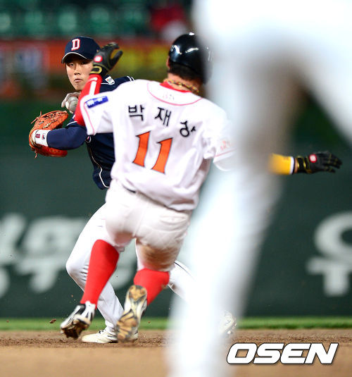 8일 오후 인천 문학구장에서 열린 2013 한국야쿠르트 세븐프로야구 SK 와이번스와 두산 베어스의 경기, 6회말 무사 1,3루에서 두산 허경민이 SK 정상호의 내야땅볼에 1루주자 박재상을 포스아웃시키고 1루로 송구하고 있다.
