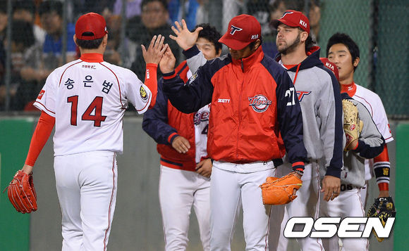 8일 오후 광주 무등구장에서 열린 '2013 한국야쿠르트 세븐 프로야구' KIA 타이거즈와 롯데 자이언츠의 경기, 7회초 KIA 송은범 투수가 위기를 넘긴후 동료들의 축하를 받고 있다
