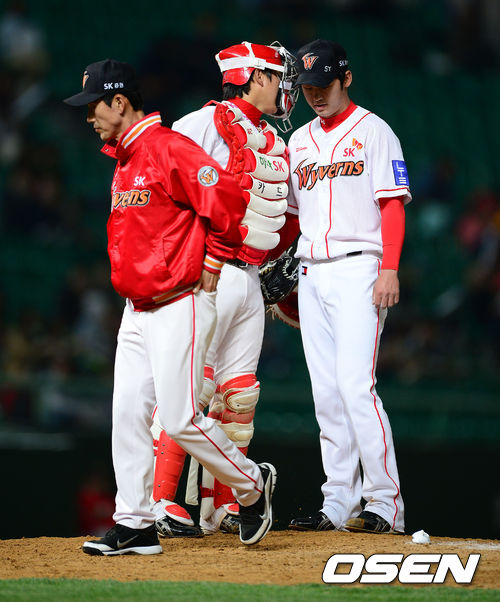 8일 오후 인천 문학구장에서 열린 2013 한국야쿠르트 세븐프로야구 SK 와이번스와 두산 베어스의 경기, 7회초 무사 1루에서 SK 성준 코치가 마운드에 올라 정상호, 진해수와 이야기를 나누고 더그아웃으로 향하고 있다.