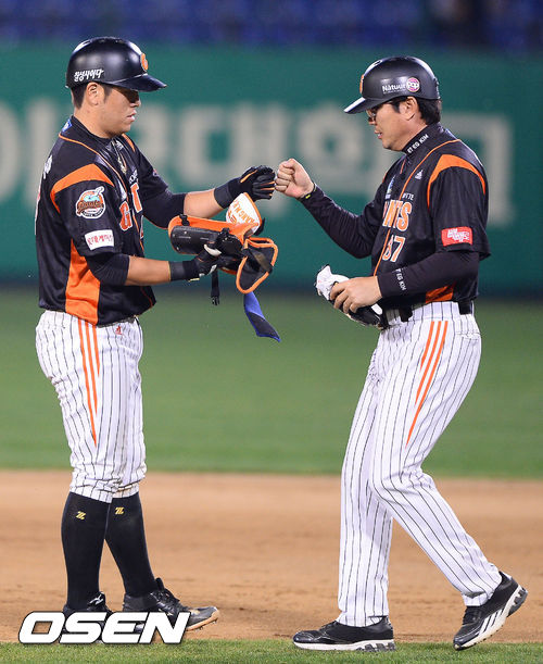 8일 오후 광주 무등구장에서 열린 '2013 한국야쿠르트 세븐 프로야구' KIA 타이거즈와 롯데 자이언츠의 경기, 9회초 1사 2루 롯데 강민호가 1타점 적시타를 날린 후 김응국 코치와 하이파이브를 하고 있다