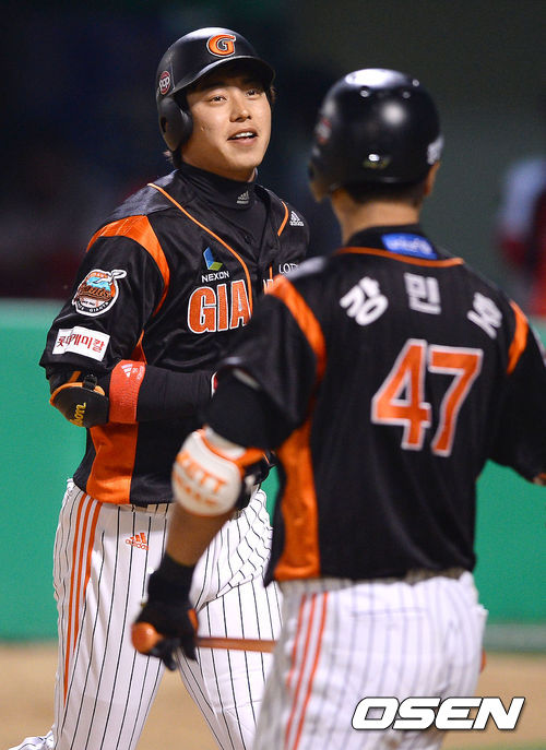 8일 오후 광주 무등구장에서 열린 '2013 한국야쿠르트 세븐 프로야구' KIA 타이거즈와 롯데 자이언츠의 경기, 9회초 무사 1,3루 롯데 김대우가 희생타를 날린 후 강민호와 하이파이브를 하고 있다