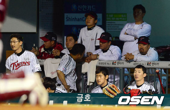 8일 오후 서울 잠실구장에서 열린 '2013 한국야쿠르트 세븐 프로야구' LG 트윈스와 넥센 히어로즈의 경기 9회말 LG 선수들이 덕아웃에서 경기를 지켜보고 있다.