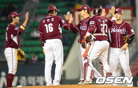 8일 오후 서울 잠실구장에서 열린 '2013 한국야쿠르트 세븐 프로야구' LG 트윈스와 넥센 히어로즈의 경기 종료 후 넥센 선수들이 하이파이브를 하고 있다.