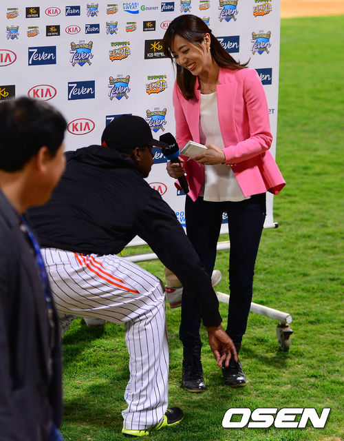 경기종료 후 롯데 유먼이 XTM 정순주 아나운서의 구두에 묻은 흙을 털어주고 있다. ./soul1014@osen.co.kr