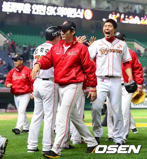 경기후 극적인 승리를 거둔 SK 선수들이 하이파이브를 하고 있다./jpnews@osen.co.kr