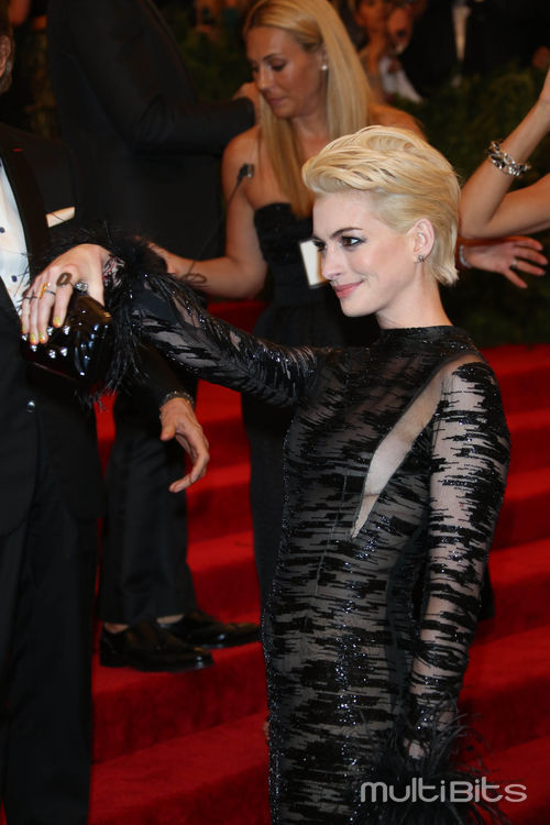6일(현지시간) 뉴욕에서 진행된 'MET Gala after party'에 남편 애덤 셜먼(32)과 모습을 드러낸 앤 해서웨이는 속살이 은근히 비치는 시스루에 숏커트한 머리를 금발로 염색 여성스러우며 세련된 모습으로 기자들의 플래시 세례를 받았다.