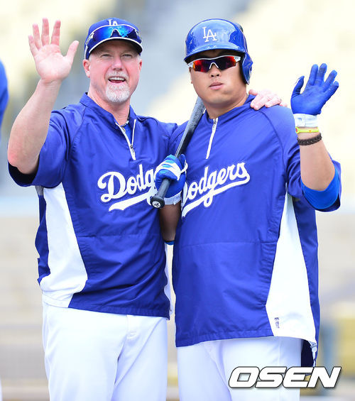 9일(이하 한국시간) 미국 캘리포니아 로스앤젤레스 다저스타디움에서 열리는 '2013 메이저리그' LA 다저스와 애리조나 다이아몬드백스 경기를 앞두고 다저스 맥과이어 타격코치와 류현진이 취재진을 향해 인사를 하고 있다.