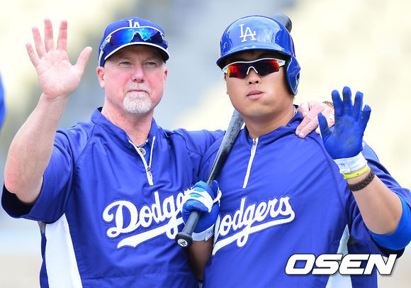 9일(이하 한국시간) 미국 캘리포니아 로스앤젤레스 다저스타디움에서 열리는 '2013 메이저리그' LA 다저스와 애리조나 다이아몬드백스 경기를 앞두고 다저스 맥과이어 타격코치와 류현진이 취재진을 향해 인사를 하고 있다.