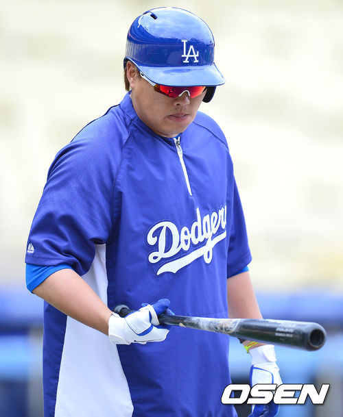 9일(이하 한국시간) 미국 캘리포니아 로스앤젤레스 다저스타디움에서 열리는 '2013 메이저리그' LA 다저스와 애리조나 다이아몬드백스 경기를 앞두고 다저스 류현진이 배트를 바라보고 있다.