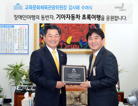 기아차가 장애인들의 발이 돼 다양한 여행기회를 제공한 사업이 국회로부터 인정받았다. 기아자동차는 9일 국회의사당에서 장애인관광 활성화에 기여한 공로를 인정받아 국회 교육문화체육관광위원장 감사패를 수상했다.