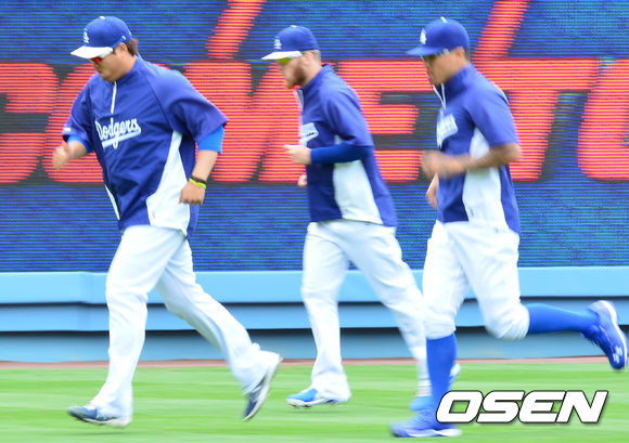 9일(이하 한국시간) 미국 캘리포니아 로스앤젤레스 다저스타디움에서 열리는 '2013 메이저리그' LA 다저스와 애리조나 다이아몬드백스 경기를 앞두고 다저스 류현진을 비롯한 선수들이 달리기로 몸을 풀고 있다.