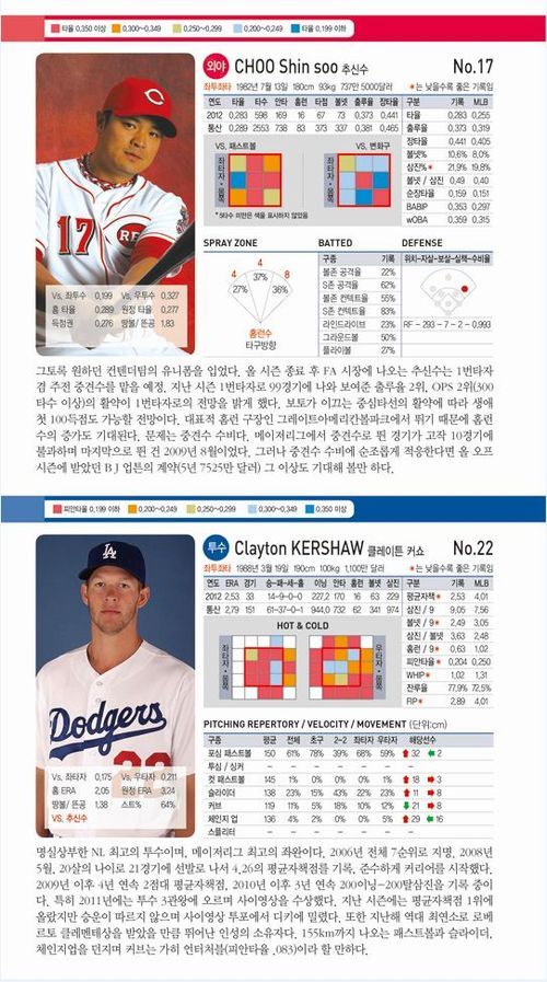 역시 가장 중요한 포인트는 구종별 투구 분석표다. 해당 투수가 2012년에 던진 모든 구종의 평균스피드, 초구와 결정구(2-2)의 구사율에 구종별 볼끝의 무브먼트를 상하좌우 화살표로 표시했다. 이 표만 보면 언제 어느 상황에 어떤 구종을 던지는지, 투수의 구위는 어떤지 한눈에 알 수 있다. 또한 스트라이크존을 9개로, 볼존을 15개로 나눈 뒤 어느 코스에서 피안타율이 높고 낮은지도 색으로 구분했다.