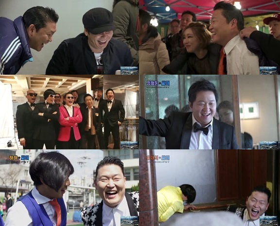 싸이는 '볼 일'을 참고 있는 유재석의 혼신을 다한 연기에 웃음을 터트렸고 '하이브리드' 에너지로 춤을 추는 하하의 모습에 감탄했다. 화제를 모았던 가인과 포장마차 신에서도 NG가 속출했다. 떡을 물어 뜯고 B급 저질댄스를 추는 싸이의 모습에 스태프 모두 박장대소했다. 양현석 대표 역시 영상을 모니터하며 웃음을 멈추지 못했다.