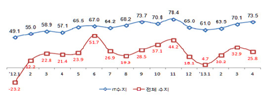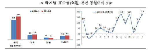 IT산업의 수출액이 4월 역대 최대인 141.3억불을 달성했다. 반도체 디스플레이 패널, 휴대폰, 디지털 TV, 컴퓨터 까지 IT 산업 전반의 고른 성장으로 8개월 연속 수출액을 늘렸다.