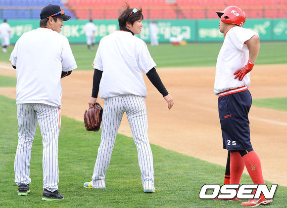 9일 오후 광주 무등구장에서 열린 '2013 한국야쿠르트 세븐 프로야구' KIA 타이거즈와 롯데 자이언츠의 경기에 앞서 롯데 김성배가 KIA 이범호에게 사과의 인사를 하고 있다. 전날 경기에서 이범호는 김성배의 투구에 맞은바 있다.