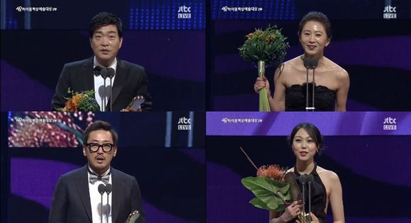 9일 오후 6시 서울 동대문구 경희대학교 평화의 전당에서 열린 백상예술대상에서 남녀 최우수 연기자상은 TV부문에서 손현주, 김희애, 영화부문에서 하정우, 김민희가 거머쥐었다.