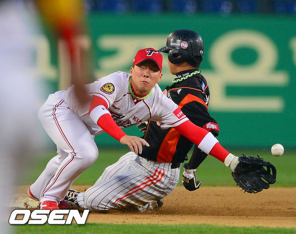9일 오후 광주 무등구장에서 열린 '2013 한국야쿠르트 세븐 프로야구' KIA 타이거즈와 롯데 자이언츠의 경기, 2회초 2사 1,2루 KIA 양현종 선발투수의 와일드피칭때 안치홍 2루수가 공을 놓치고 있다. 그 사이 2루 주자 용덕한은 득점.