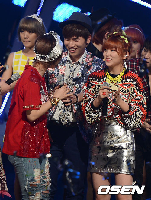 9일 오후 서울 상암동 CJ E&M에서 진행된 Mnet '엠카운트다운'(이하 엠카) 생방송에서 케이윌이 1위를 차지한 포미닛 전지윤에게 마이크를 건네며 축하를 해주고 있다.