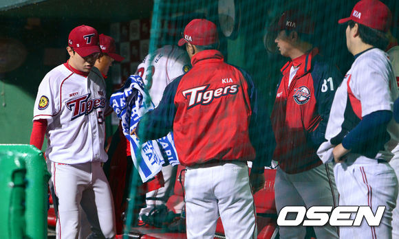 9일 오후 광주 무등구장에서 열린 '2013 한국야쿠르트 세븐 프로야구' KIA 타이거즈와 롯데 자이언츠의 경기, 3회초 갑작스러운 폭우로 경기가 중단되자 KIA 양현종 투수가 더그아웃을 빠져나가고 있다