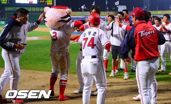 우천취소 세레모니를 펼친 KIA 나지완이 동료들과 기쁨을 나누고 있다./soul1014@osen.co.kr