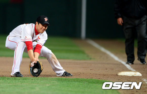 9일 오후 인천 문학구장에서 열린 2013 한국야쿠르트 세븐프로야구 SK 와이번스와 두산 베어스의 경기, 4회초 1사 1,2루에서 SK 한동민이 두산 이종욱의 1루땅볼 타구를 잡아내고 있다.
