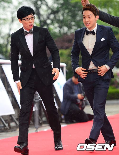 9일 오후 서울 동대문구 회기동 경희대학교 평화의전당에서 열린 '제49회 백상예술대상'에서 유재석과 허경환이 레드카펫을 밟고 있다.
