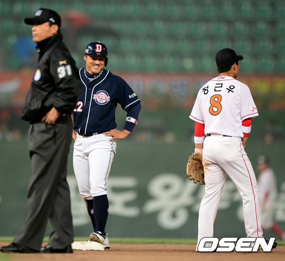 9일 오후 인천 문학구장에서 열린 2013 한국야쿠르트 세븐프로야구 SK 와이번스와 두산 베어스의 경기, 9대0으로 앞선 6회초 1사 1,2루 두산의 공격, 홍성흔과 SK 정근우가 이야기를 나누고 있다.