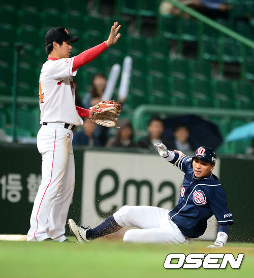 9일 오후 인천 문학구장에서 열린 2013 한국야쿠르트 세븐프로야구 SK 와이번스와 두산 베어스의 경기, 5회초 2사 3루에서 두산 이종욱이 1타점 적시 3루타를 날리고 슬라이딩으로 세이프되고 있다.
