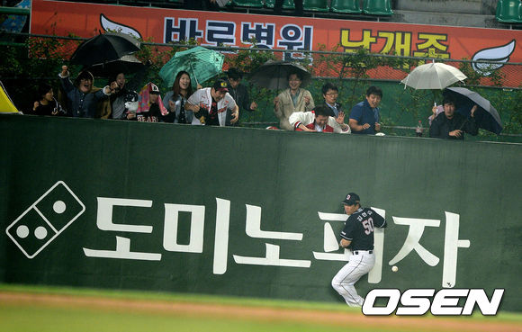 9일 오후 인천 문학구장에서 열린 2013 한국야쿠르트 세븐프로야구 SK 와이번스와 두산 베어스의 경기, 6회말 1사 2,3루에서 두산 김현수가 SK 한동민의 타구를 펜스앞에서 놓치자 SK 팬들이 기뻐하고 있다.