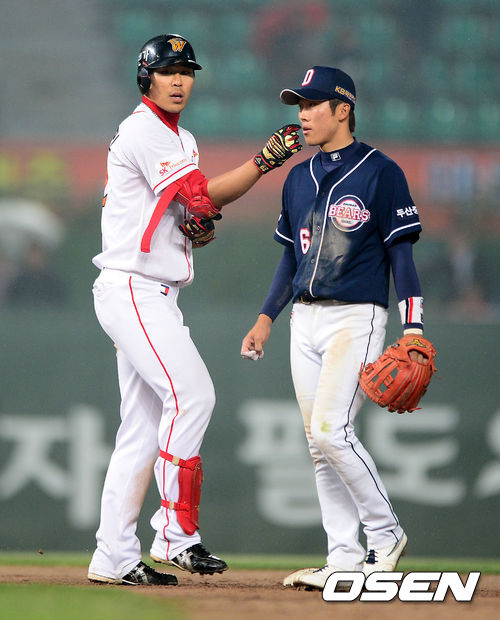 9일 오후 인천 문학구장에서 열린 2013 한국야쿠르트 세븐프로야구 SK 와이번스와 두산 베어스의 경기, 6회말 1사 2,3루에서 SK 한동민이 2타점 적시 2루타를 날리고 기뻐하고 있다.