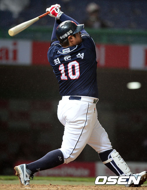 9일 오후 인천 문학구장에서 열린 2013 한국야쿠르트 세븐프로야구 SK 와이번스와 두산 베어스의 경기, 8회초 1사에서 두산 최준석이 중월 솔로포를 날리고 타구를 바라보고 있다.