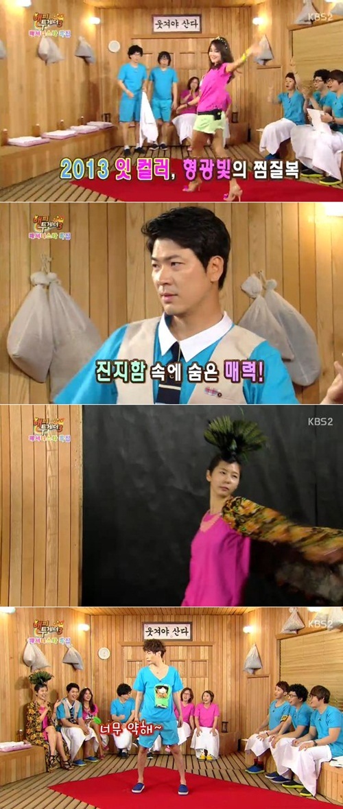 엄정화는 미키마우스가 새겨진 형광 찜질복을 입고 나이를 뛰어넘는 몸매를 드러내며 남다른 패션 센스를 뽐냈다. 이어 김상경은 정장을 형상화한 찜질복, 김나영은 새를 머리에 얹고 얇은 아우터를 휘날리며 등장했다. 또한 뮤지는 자신의 두 딸을 의미하는 호랑이와 용을 앞뒤에 위치시켰다.