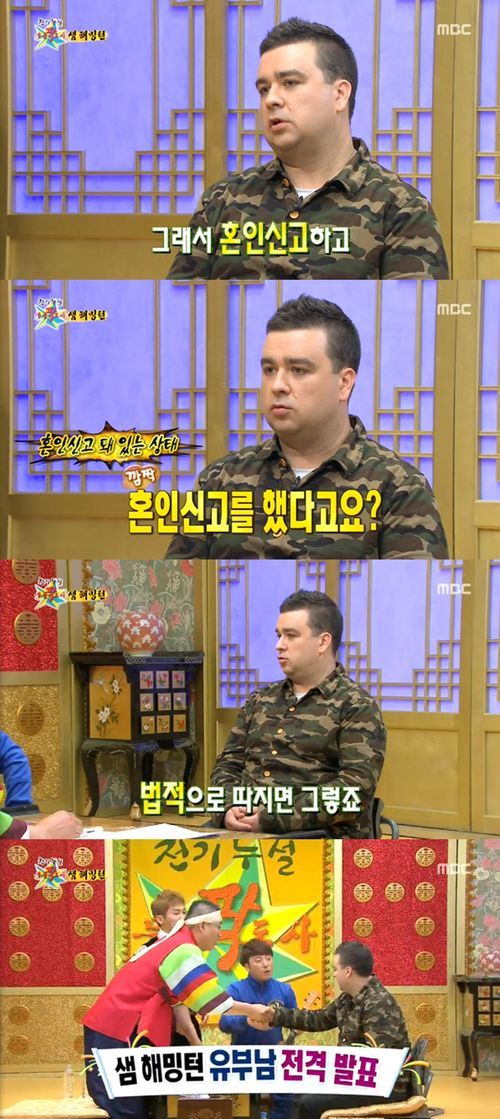 이에 MC들이 "그럼 유부남이냐"고 묻자 샘 해밍턴은 덤덤하게 "법적으로 따지면 그렇다"고 말했다.