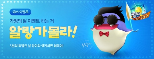 엔트리브소프트 골프게임 '팡야'는 가정의 달을 맞이해 오는 18일까지 특별 이벤트를 진행한다. 주말 낮 12시부터 24시까지 접속한 모든 유저에게 팡과 경험치를 2배로 제공하며, 주말 저녁 특정시간대 팡야 피규어 등 푸짐한 경품이 걸린 홀인원 이벤트를 연다. 또, 각종 기념일에 접속만하면 인기 아이템을 제공한다.
