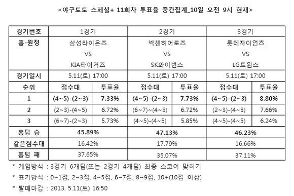 국내프로야구(KBO) 주말 3경기 대상 야구토토 스페셜+ 11회차 투표율 중간집계