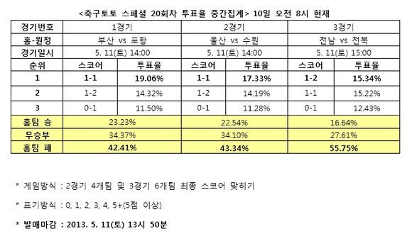 K리그 클래식 3경기 대상 축구토토 스페셜 20회차 투표율 중간집계 결과