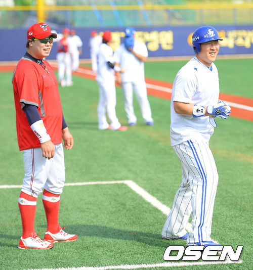 10일 오후 경북 포항구장에서 열리는 '2013 한국야쿠르트 세븐 프로야구' 삼성 라이온즈와 KIA 타이거즈의 경기, 경기에 앞서 KIA 나지완이 삼성 최형우와 이야기를 나누고 있다.