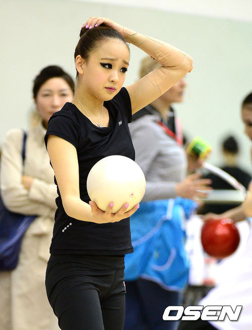 리듬체조 국가대표 선발전에 출전한 손연재가 볼 연기 연습을 하며 머리를 만지고 있다.