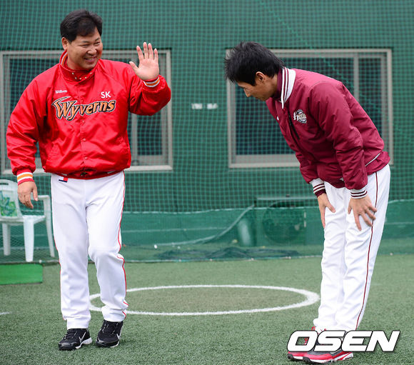 10일 오후 서울 목동구장에서 열리는 '2013 한국야쿠르트 세븐 프로야구' 넥센 히어로즈와 SK 와이번스의 경기 시작 전 이만수 감독과 염경엽 감독이 인사를 나누고 있다.
