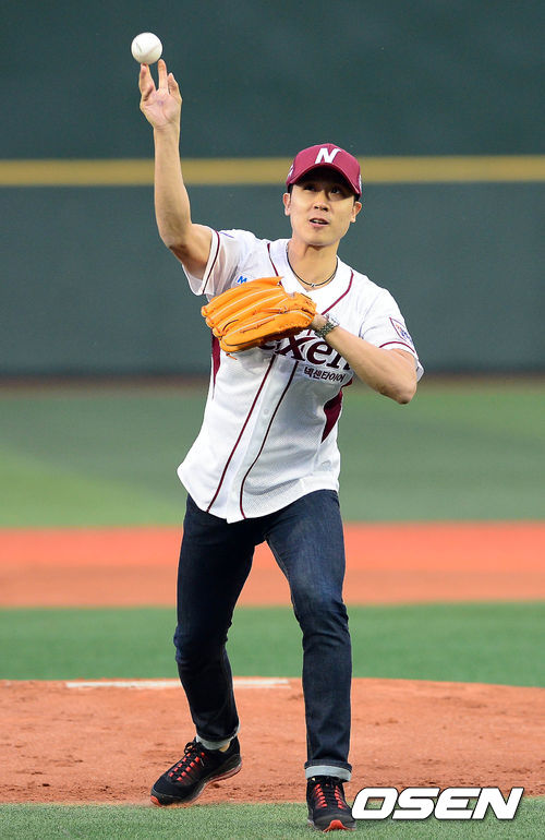 10일 오후 서울 목동구장에서 열린 '2013 한국야쿠르트 세븐 프로야구' 넥센 히어로즈와 SK 와이번스의 경기 시작 전 KGC인삼공사 김태술이 시구를 하고 있다.