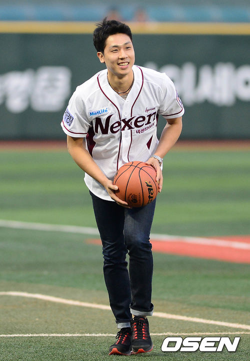 10일 오후 서울 목동구장에서 열린 '2013 한국야쿠르트 세븐 프로야구' 넥센 히어로즈와 SK 와이번스의 경기 시작 전 KGC인삼공사 김태술이 시구를 한 후 턱돌이와 장난을 치고 있다.