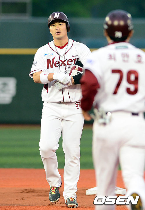 10일 오후 서울 목동구장에서 열린 '2013 한국야쿠르트 세븐 프로야구' 넥센 히어로즈와 SK 와이번스의 경기 1회말 2사 1루 박병호가 1타점 2루타를 치고 최만호 코치에게 장비를 건내고 있다.