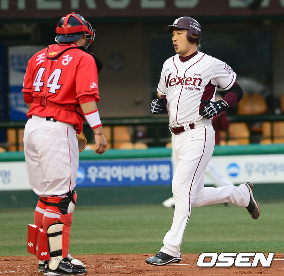 10일 오후 서울 목동구장에서 열린 '2013 한국야쿠르트 세븐 프로야구' 넥센 히어로즈와 SK 와이번스의 경기 1회말 2사 1루 박병호의 1타점 2루타에 이택근이 홈을 밟고 있다.