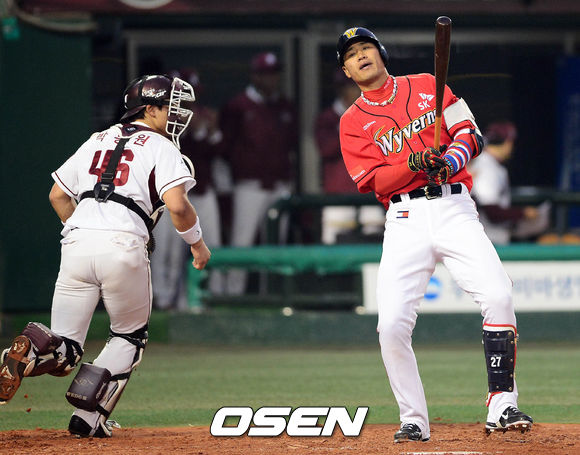 10일 오후 서울 목동구장에서 열린 '2013 한국야쿠르트 세븐 프로야구' 넥센 히어로즈와 SK 와이번스의 경기 3회초 2사 1,3루 김상현이 헛스윙 삼진을 당한 후 아쉬워하고 있다.