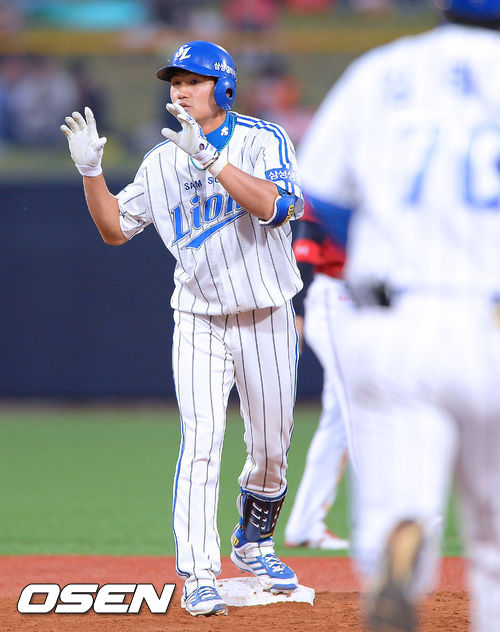 10일 오후 경북 포항구장에서 열린 '2013 한국야쿠르트 세븐 프로야구' 삼성 라이온즈와 KIA 타이거즈의 경기, 2회말 2사 1,2루 삼성 김상수가 선취 2타점 적시타를 날리고 타임을 요청하고 있다