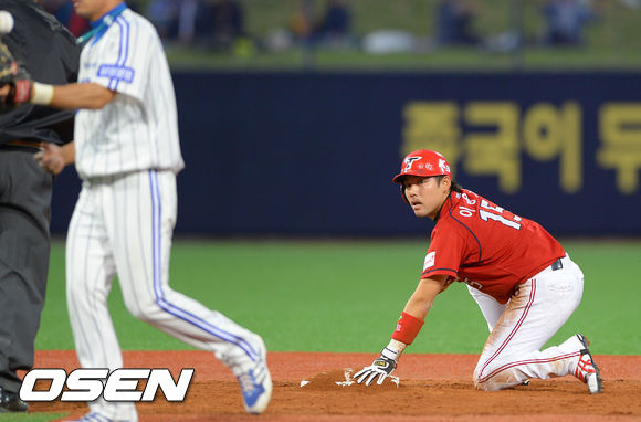 10일 오후 경북 포항구장에서 열린 '2013 한국야쿠르트 세븐 프로야구' 삼성 라이온즈와 KIA 타이거즈의 경기, 3회초 무사 1루 KIA 김선빈의 타석때 1루 주자 이용규가 삼성 김상수 유격수에게 태그아웃된 후 아쉬워하고 있다