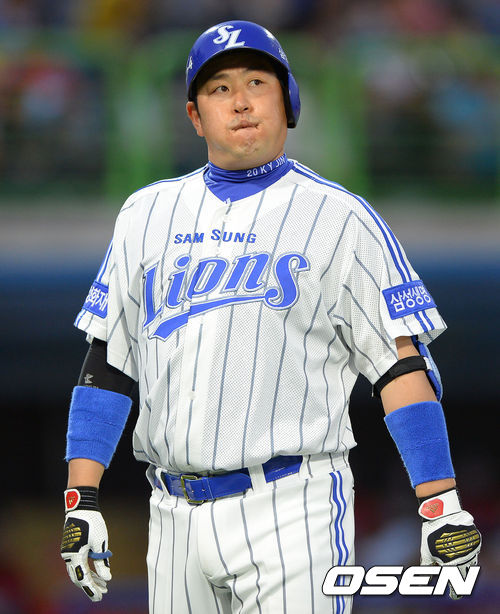 10일 오후 경북 포항구장에서 열린 '2013 한국야쿠르트 세븐 프로야구' 삼성 라이온즈와 KIA 타이거즈의 경기, 2회말 1사 1,2루 삼성 진갑용이 파울플라이로 아웃되자 아쉬운 표정을 짓고 있다